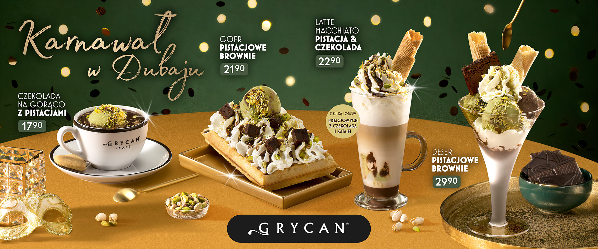 Czas na karnawał pełen smaku! W limitowanej ofercie Karnawał w Dubaju królują pistacje, czekolada i chrupiące ciasto kataifi – połączenie, które rozpieszcza zmysły. Odkryj kilka apetycznych odsłon:
